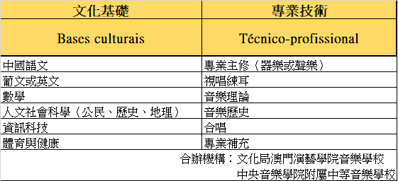 從2022年起,文化局與教青局合作開辦初中“表演藝術班”,為新一屆音樂職業技術高中課程奠定基礎。2025-2026年開始由中葡職業技術學校與澳門演藝學院共同合辦“音樂表演專業課程”在2009年起與中央音樂學院簽署雙方聯合辦學協議,由澳門文化局轄下澳門演藝學院音樂學校與中央音樂學院轄下中央音樂學院附屬中等音樂學校聯合開辦首屆全日制音樂技術課程。