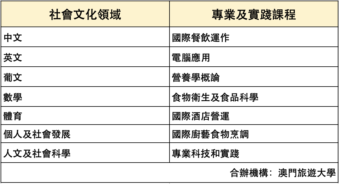 特區政府一向重視澳門的職業技術教育,而飲食業更是民生的重要行業。 中葡職業技術學校自2019年9月,與澳門旅遊大學合作,共同開辦高中國際廚藝課程,學生將具備到各大酒店相關部門工作的能力, 成為職場上的新力軍,為行業提供穩定的專業技術人員。