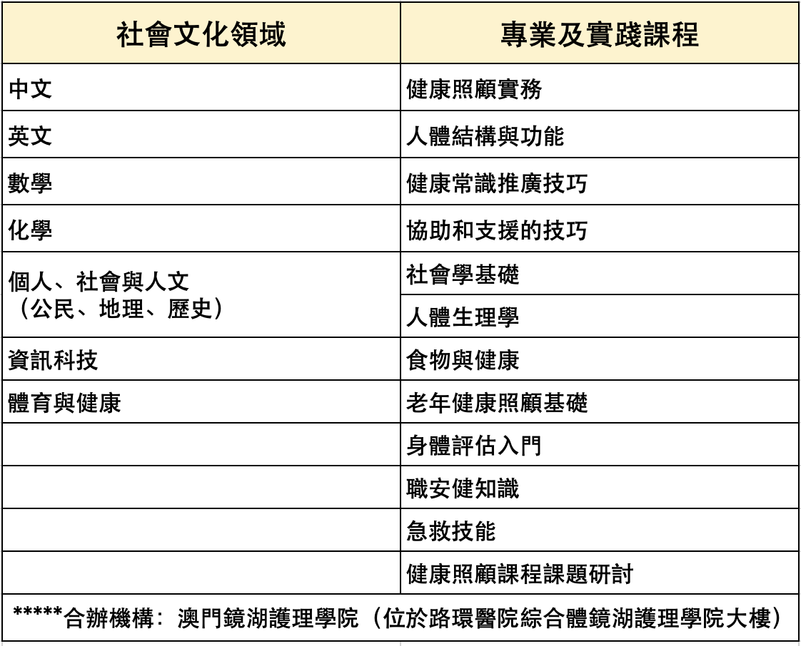 - 與鏡湖護理學院所合辦的課程,專業技能科目由學院資深老師團隊任教,提供優質的教學。